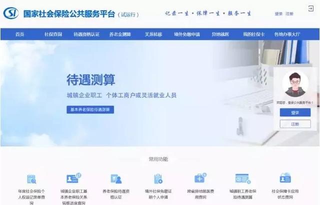 公共服务平台功能很强大,能提供全国性、跨地区的社保公共服务。目前可以进行社保查询、待遇资格认证、养老金测算、社保转移查询、境外免缴申请、异地就医查询、社保卡查询、各地社保网上办事大厅导航等。
