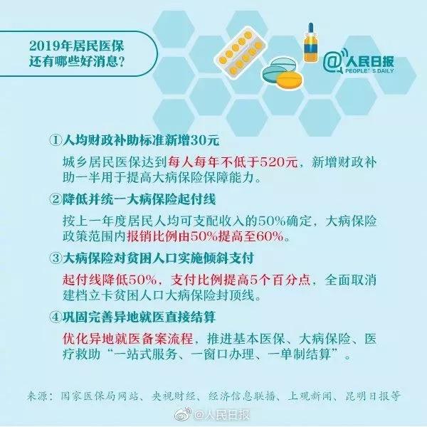 《通知》指明,2019年城乡居民医保人均财政补助标准新增30元,达到每人每年不低于520元,新增财政补助一半用于提高大病保险保障能力(在2018年人均筹资标准上增加15元);