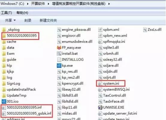 第四步:备份数据,备份开票软件根目录中(win7系统:右键开票软件快捷方式图标→属性→打开文件位置;XP系统:右键开票软件快捷方式图标→属性→查找目标)的数据【三个税号文件及system.ini】,如下图所示: