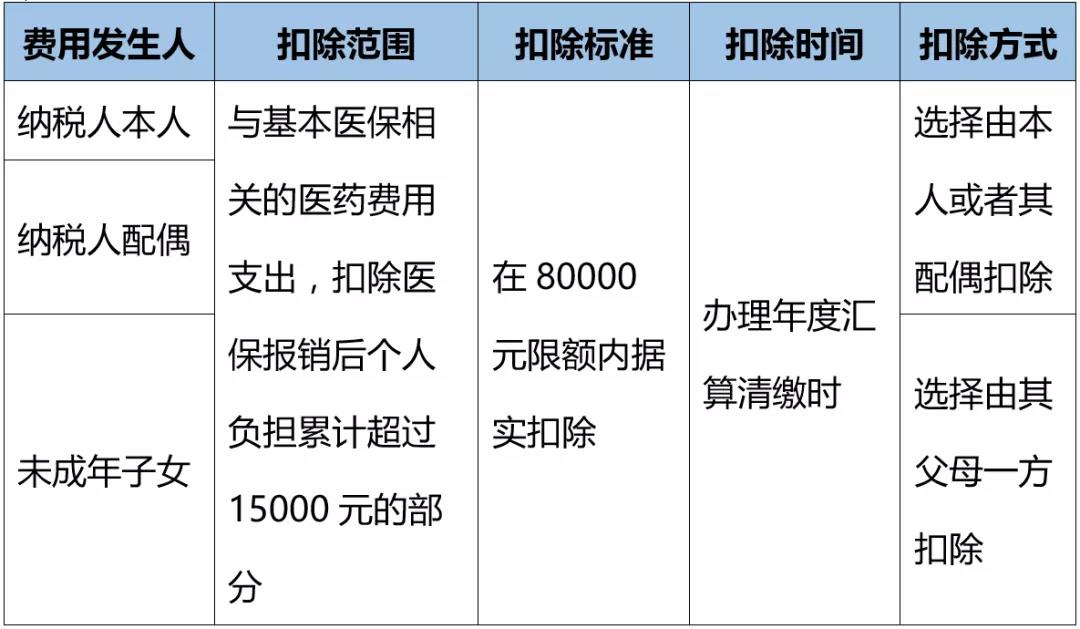 在一个纳税年度内,纳税人发生的与基本医保相关的医药费用支出,扣除医保报销后个人负担(指医保目录范围内的自付部分)累计超过15000元的部分,由纳税人在办理年度汇算清缴时,在80000元限额内据实扣除。