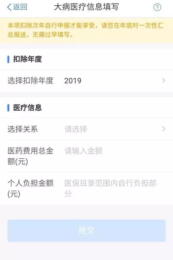 3. 填写大病医疗相关信息选择扣除年度;与纳税人的关系:可选择“本人”“配偶”“子女”;据实录入医疗费用总金额;据实填写扣除医保报销后个人负担金额(指医保目录范围内的自付部分)。完成填写后,点击【提交】。完成以上三步后,在次年3月1日至6月30日进行年度汇算清缴时就可以扣除了。