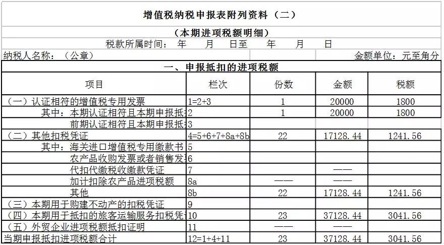 本行“税额”列=720+191.56+180+150=1241.56(元),本行填写企业取得的除增值税专用发票以外的其他扣税凭证允许抵扣的进项税额。