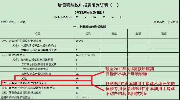 答:按照规定,截至2019年3月税款所属期,《增值税纳税申报表附列资料(五)》第6栏“期末待抵扣不动产进项税额”的期末余额,可以自2019年4月税款所属期结转填入《增值税纳税申报表附列资料(二)》第8b栏“其他”中。