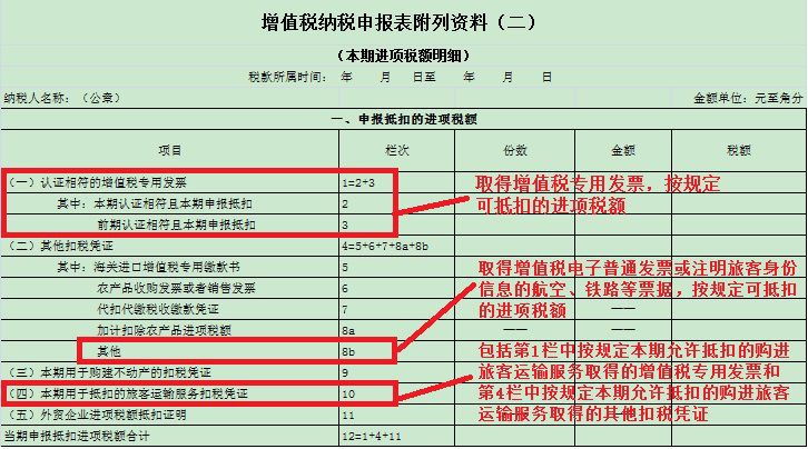 (2)取得增值税电子普通发票或注明旅客身份信息的航空、铁路等票据,按规定可抵扣的进项税额,在申报时填写在《增值税纳税申报表附列资料(二)》第8b栏“其他”中。