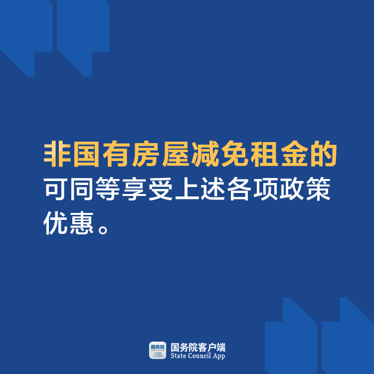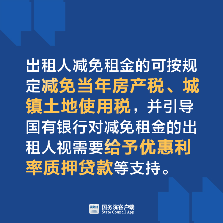 为减轻小微企业和个体工商户房租负担,近日召开的国务院常务会议确定,推动对承租国有房屋的服务业小微企业和个体工商户,免除上半年3个月租金。国有企业尤其是央企和高校、研究院所等企事业单位要带头。出租人减免租金的可按规定减免当年房产税、城镇土地使用税,并引导国有银行对减免租金的出租人视需要给予优惠利率质押贷款等支持。非国有房屋减免租金的可同等享受上述各项政策优惠