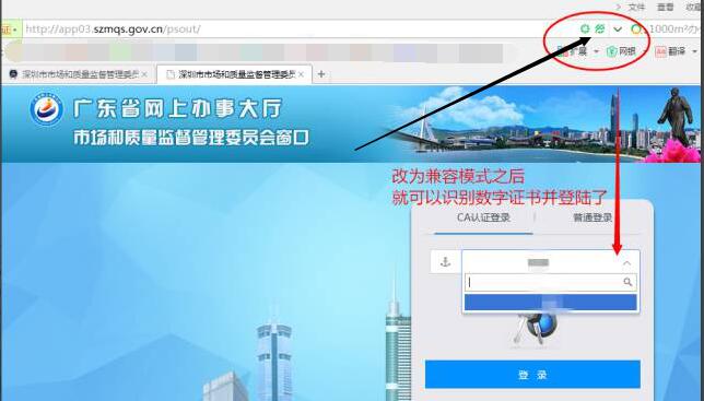 登录市监委网站进行数字证书认证的时候(还有很多其他政府网站登录需要CA认证的,都一样),大多要求使用IE浏览器,如果您使用了360浏览器,请切换至“兼容模式”。